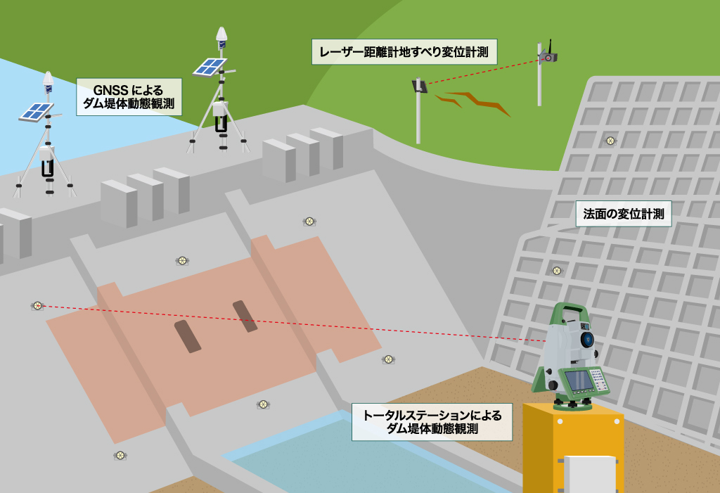 自動視準トータルステーションやGNSS受信機を使用し、地盤や既設構造物の挙動を3次元計測するシステムです。計測データはWEBブラウザ(K-Cloud)に表示され、遠隔地からでも確認できます。