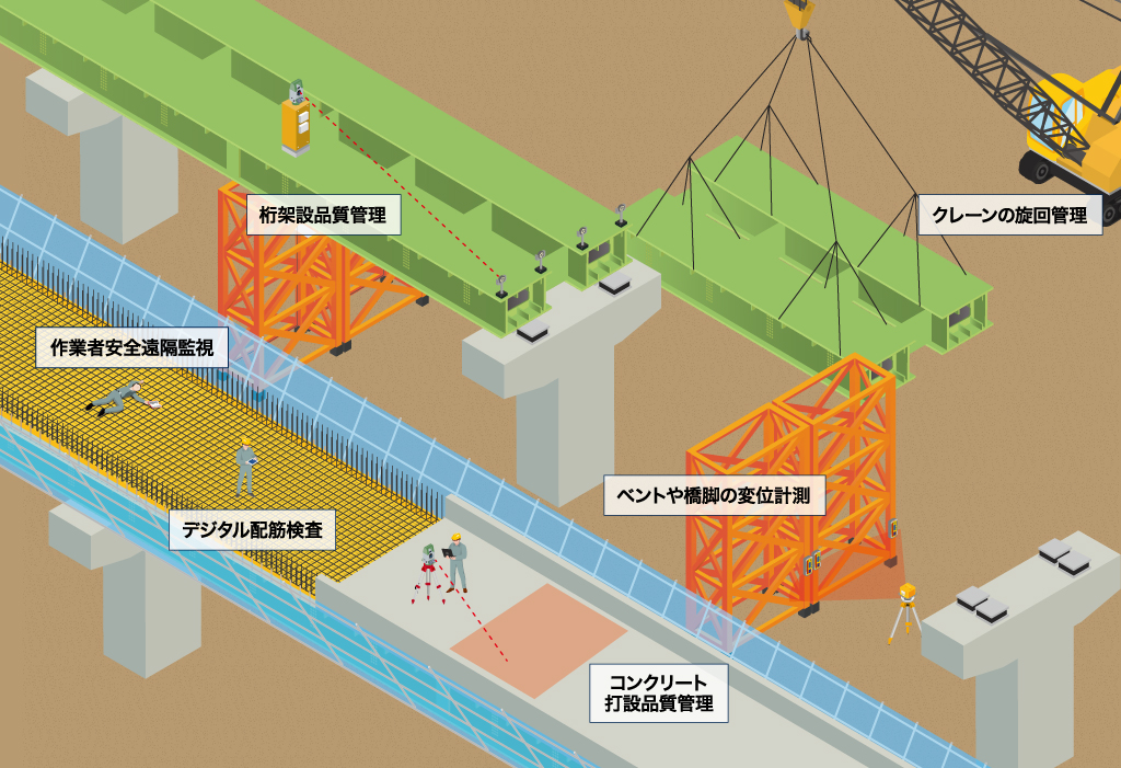 傾斜センサーを設置して橋梁現場におけるベントやサンドル、橋脚、橋台や、法面の傾斜変位を観測するシステムです。無線でデータを取り込み、WEBブラウザ(K-Cloud)に表示します。緊急性が高い現場において、常時傾斜計測することで現場の安全を守ります。電源を繋げることで常に稼働し、遠隔地のパソコンから任意の時間に計測指示、計測設定の変更が可能です。