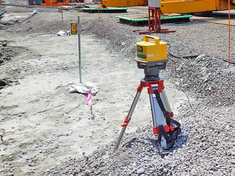 ワイヤレスの受光センサーと回転レーザーレベルを使って、一度に複数箇所の沈下・隆起を素早く計測するシステムです。